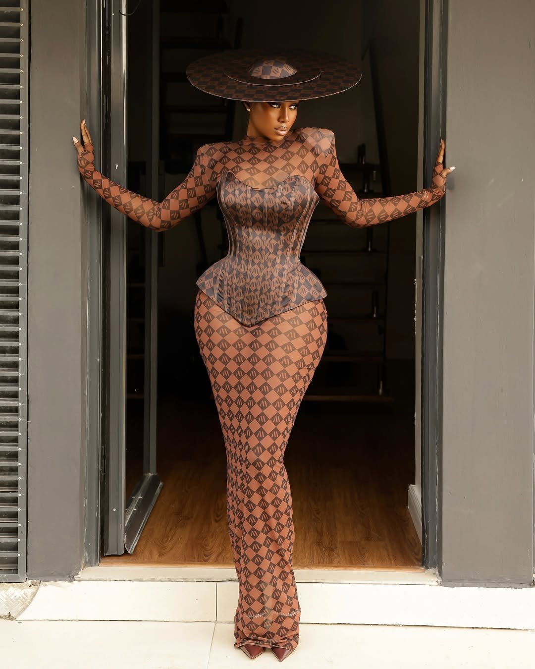 The sheer mesh fabric added just the right touch of edge, while the sculpted corset at her waist brought structure and drama that made the outfit unforgettable. On top of it all, a wide-brimmed hat in the same print completed the look.