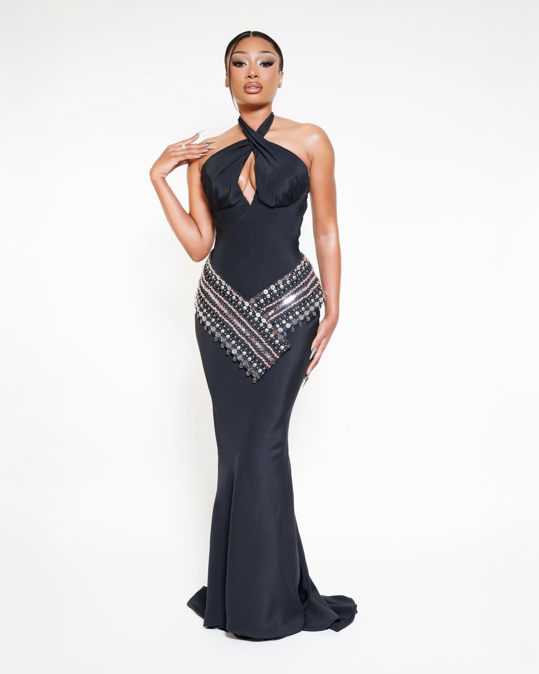 Megan Thee Stallion threw the first-ever Pete & Thomas Foundation Gala in New York, and she did it in full glamour. The rapper showed up in a black Off-White gown that hugged her figure, with bold beaded hips and a floor-sweeping mermaid skirt.