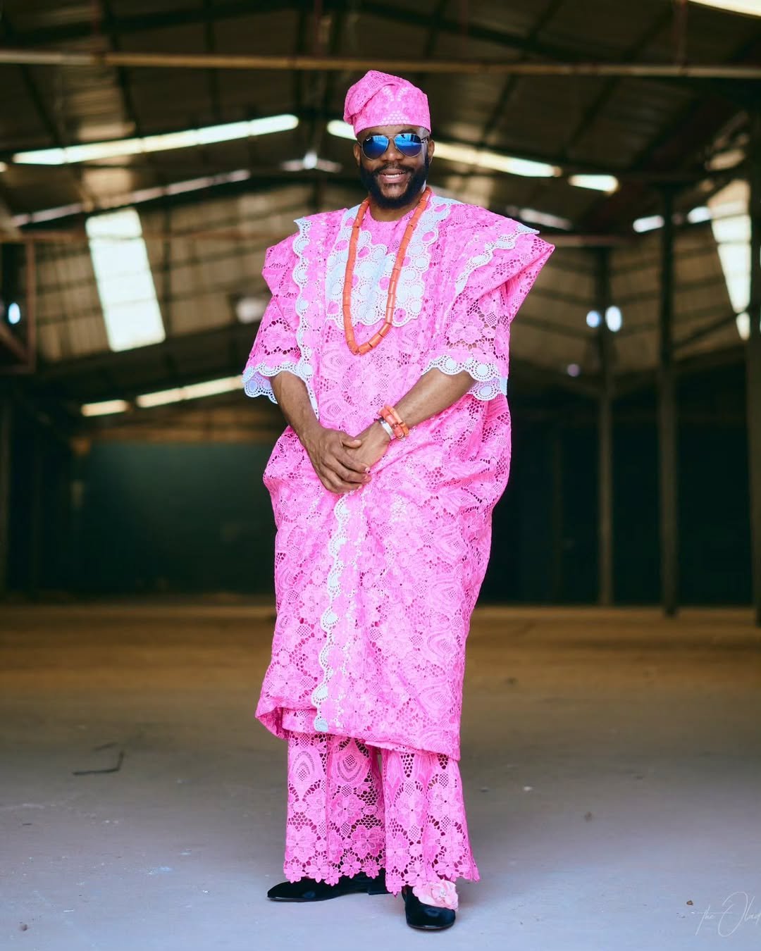 He completed the outfit with coral beads around his neck and wrists, while his dark sunglasses brought a hint of modern cool. His fila, crafted from the same pink lace, is so grand. Black shoes finished it off neatly, allowing the agbada to be the star of the moment.